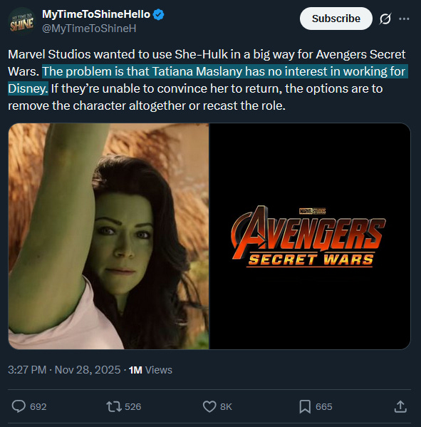 In September 2025, Tatiana Maslany posted on her Instagram Story, sharing a behind-the-scenes photo from She-Hulk with the message: “cancel your @disneyplus @hulu @espn subscriptions!”