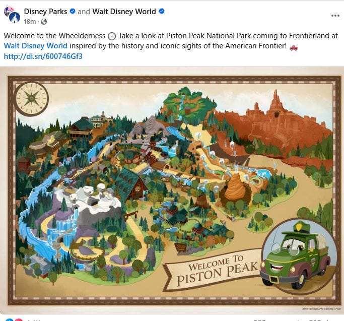 Previously, it was announced that they would be removing the Rivers of America and Tom Sawyer Island to add a new Cars attraction, but that wasn’t enough for Iger. Now they are turning all of Frontierland into Piston Peak National Park.