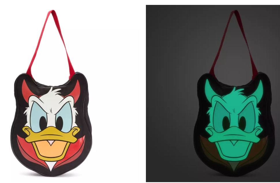 The tote features a glow-in-the-dark print of Donald Duck as the devil. It measures 20'' H x 15 3/4'' W x 4'' D, with a strap drop of about 14”