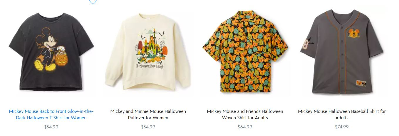 Other pieces in the collection include a Mickey Mouse glow-in-the-dark t-shirt. A Halloween pullover with Mickey and Minnie. An allover print shirt with a button front and a collar. The baseball shirt we saw previously
