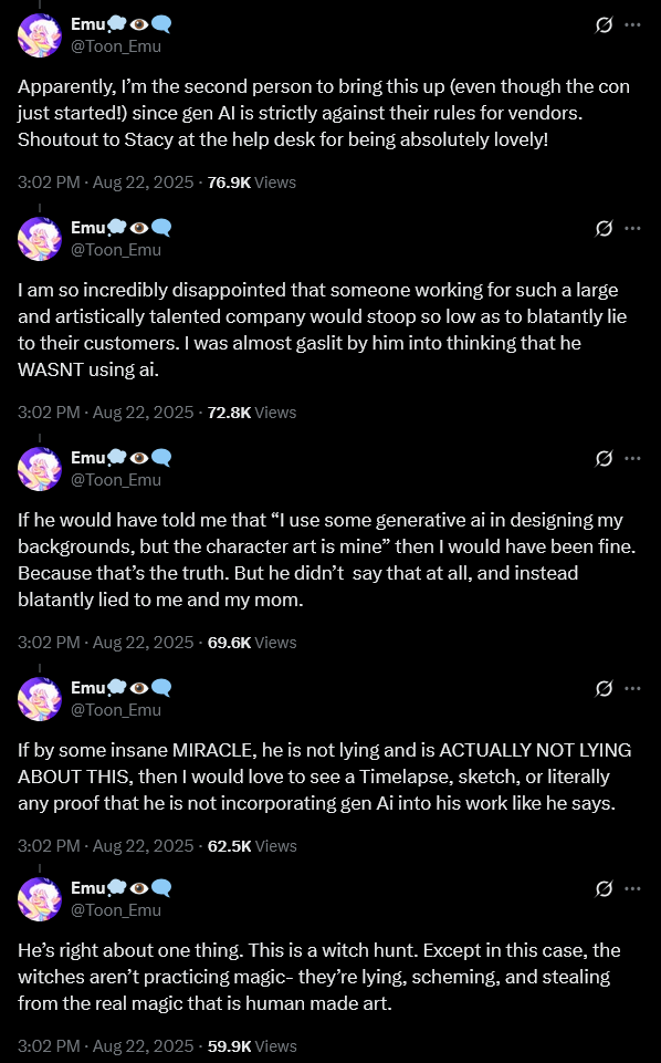 August 22, 2025 – Anime NYC Confrontation: At Anime NYC, Twitter user @Toon_Emu approached Mulligan’s booth (per BiC), where he was selling prints and leveraging his Lorcana credentials. When asked if he used generative AI, Mulligan denied it, calling accusations an “industry witch hunt to ruin people’s careers.” He showed Procreate layers on his tablet, suggesting manual work, but the background appeared copy-pasted, and he claimed no timelapse was saved—despite Procreate’s automatic recording. Rosy, the artist, later posted on Twitter that Mulligan “blatantly lied” and “scammed” their mother out of hundreds in prints. The post, which included images of Mulligan’s Lorcana cards (Flounder – Collector’s Companion, Transformed Chef – Castle Stove, White Rabbit – Royal Herald), went viral with over 5,700 likes.