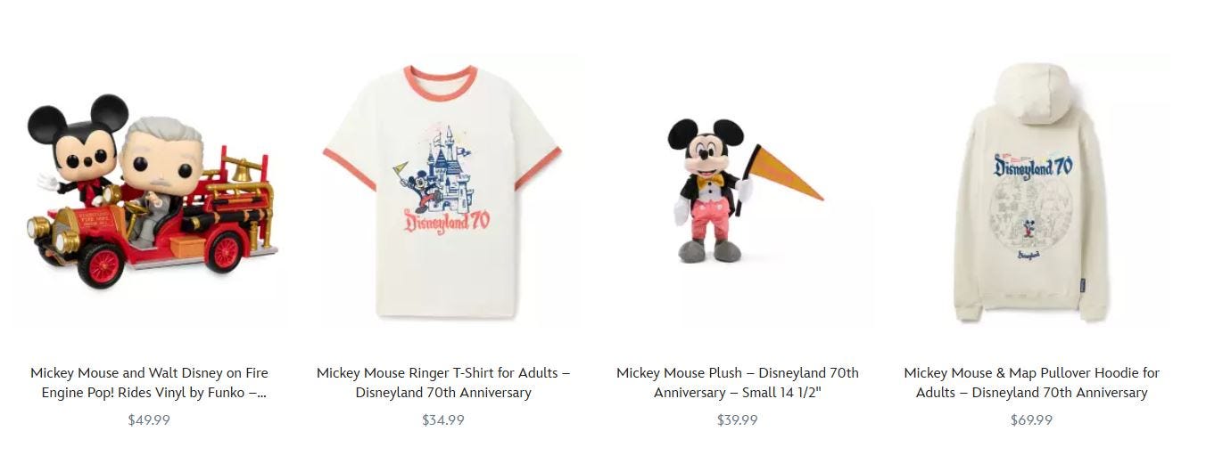 Prices range from $19.99-$79.99. Pieces include ornaments, accessories, a plush, household items, apparel, and a Funko Pop! featuring Walt Disney and Mickey Mouse.