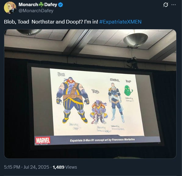 The chatter around Doop spiked in 2025, fueled by San Diego Comic-Con highlights from July 25, where Marvel unveiled concept art for Expatriate X-Men #1. This new series, written by Eve L. Ewing with art by Francesco Mortarino, features Doop alongside Blob, Northstar, Toad, and a quirky Dragonfly variant, set in a post-apocalyptic X-Men tale after a mutant civil war. The panel on “MARVEL Cosmic Invasion Deep Dive” teased this divided United States story, sparking revival excitement.