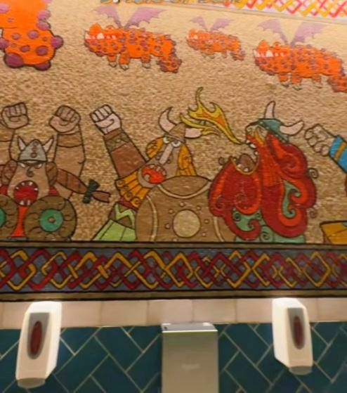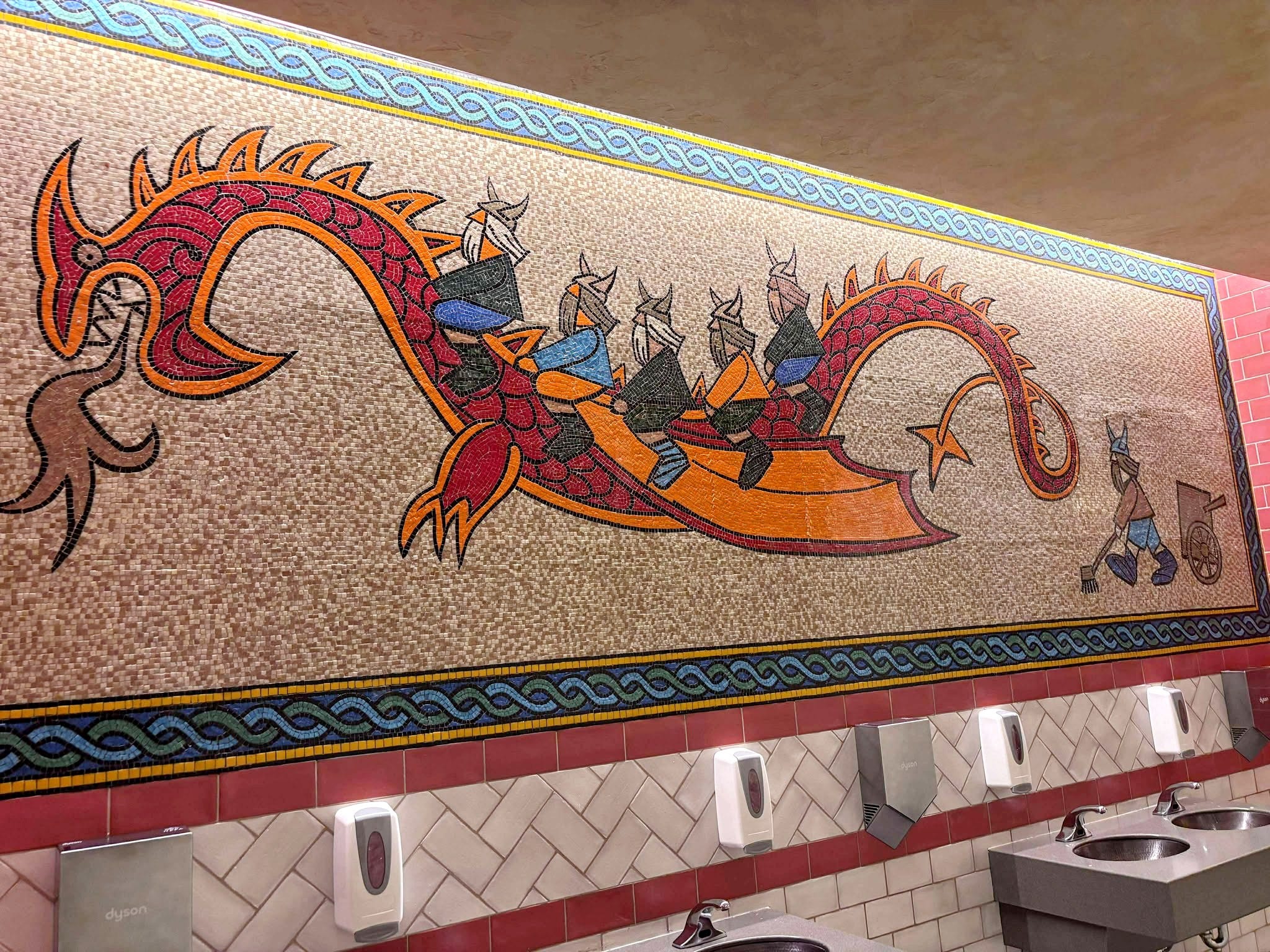 The bathroom mosaic is fun. It shows some Vikings riding a dragon with another Viking following behind with a dustpan and broom, like you see behind horses in parades or events.