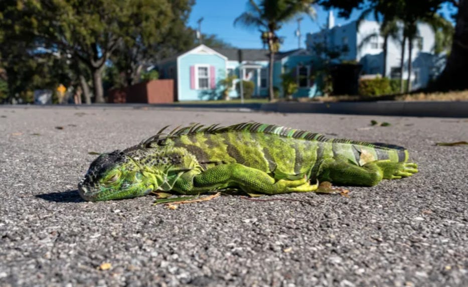 USA Today, “Iguanas look ‘frozen,’ fall from trees as temps drop in South Florida,” February 2, 2026: https://www.usatoday.com/story/news/weather/2026/02/02/frozen-iguanas-fall-trees-florida/88475628007