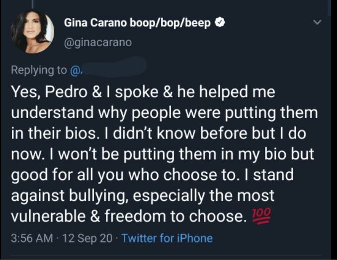 Back in 2020 people started to demand that Carano put pronouns in her Twitter bio. She did not feel comfortable doing so, but it doesn’t matter if the mod decides you need to do something.