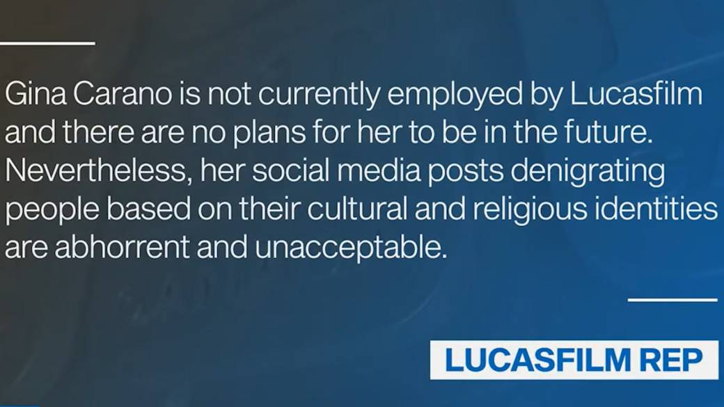 "Gina Carano is not currently employed by Lucasfilm and there are no plans for her to be in the future. Nevertheless, her social media posts denigrating people based on their cultural and religious identities are abhorrent and unacceptable."
