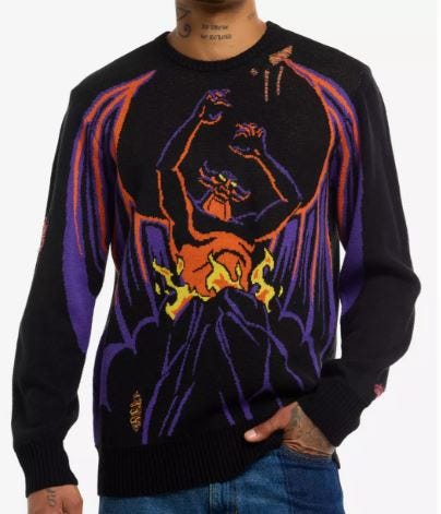 “This knit sweater from Fantasia features a jumbo knit of Chernabog from the Night on Bald Mountain segment, with colorful distressed details knit throughout.