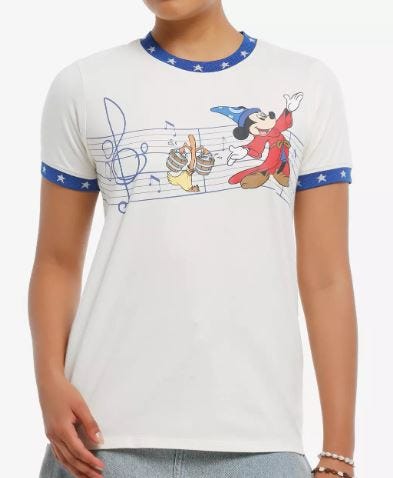“…featuring Mickey Mouse in his sorcerer's apprentice outfit leading a broomstick across a music staff. Comes with blue ringer details with silver-tone glitter stars and the Fantasia logo printed on the back.
