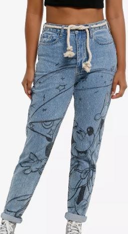 “These mom jeans from Fantasia feature a jumbo sketch across both legs of Mickey Mouse from The Sorcerer's Apprentice, plus a rope cord belt inspired by his robes, and a patch of his iconic Sorcerer Hat on the back pocket. Comes with rolled cuffs.