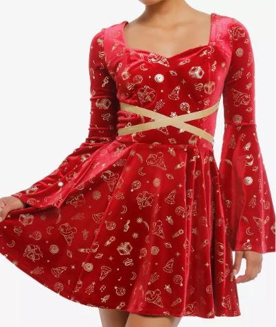 “Get swept up in the magic of Fantasia with this velvety red dress, inspired by Mickey Mouse's sorcerer's apprentice robe. Comes with a gold-tone metallic print of icons from The Sorcerer's Apprentice segment, plus bell sleeves, a fixed gold-tone ribbon across the waist and pockets at the skirt.