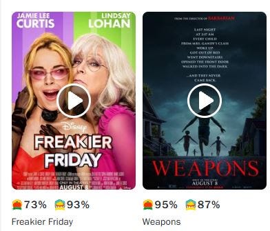 Both films are good. I actually went to “Freakier Friday” with my daughter, while my son and his friend went to see “Weapons.” I gave “Freakier Friday” a good review, and my son loved “Weapons” so much he wants to go see it again.