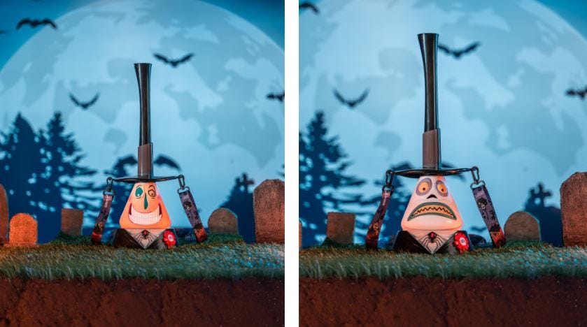 The Nightmare Before Christmas sipper features the Mayor. It has two sides, with one side featuring his happy face and one side featuring his worried face. His hat is the straw, and it features a Halloween-themed Disney Parks strap.
