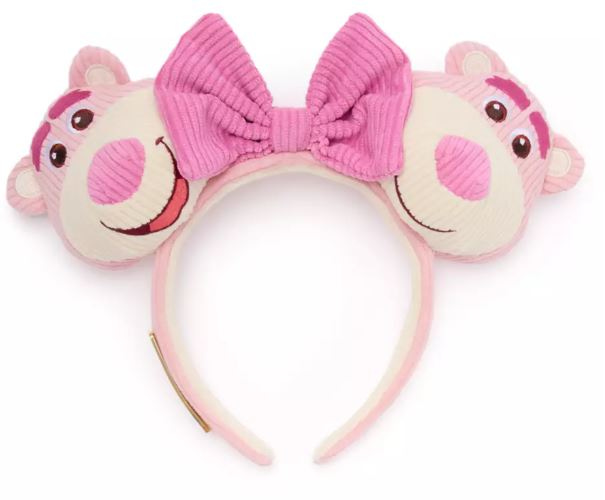 “Featuring his signature strawberry aroma, the normally red bear has been given a pink makeover as part of the Pastel Character Series. The padded corduroy ears are embroidered with Lotso's chirpy face, and a corduroy bow tops off this charming headwear that's full of character.