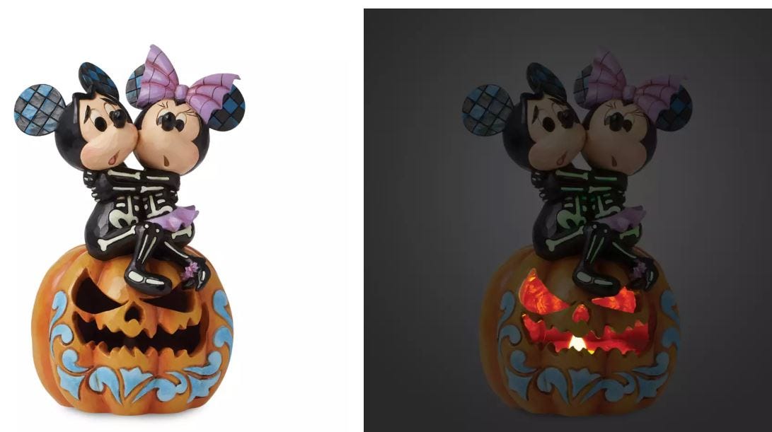“In this spooky Jim Shore scene, Mickey and Minnie Mouse don skeleton costumes as they tightly embrace each other atop a rosemaling-clad jack-o'-lantern. While ''candlelight'' flickers, their expressions of apprehension capture the fun and nostalgia of Halloween fright nights.”
