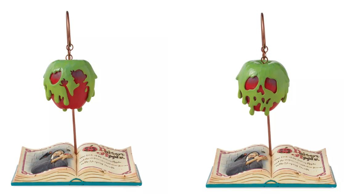 “This wicked Jim Shore design features the Evil Queen's spell book from Snow White and the Seven Dwarfs. Lying open, it reveals a page describing the Poison Apple curse, with an image of the Queen as Hag accompanying the text. Suspended from a wire, extending out from the book, is the ominous skull-shaped apple, dripping in The Sleeping Death!”
