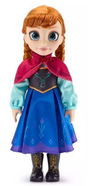 “Anna is imagined in her early years, exquisitely costumed in a deluxe satin traveling dress with floral detailing, plus lace and ''fur'' trimmed cape. The Frozen princess' beautiful braided hair, boots and haircomb complete the ensemble.”