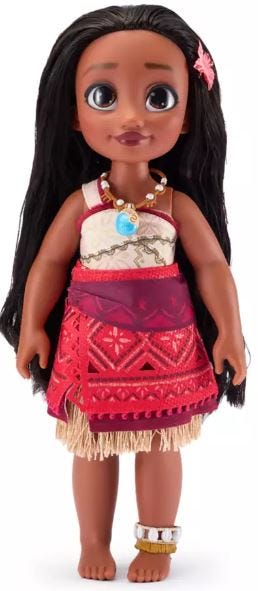 “Our 16'' doll revisits Moana as a little girl with a big imagination who dared to dream of voyaging across the sea. Complete with a film-authentic ''tapa'' print dress, Heart of Te Fiti necklace, plus Pua haircomb…”
