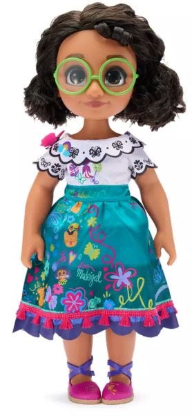 “Our 16'' doll revisits Mirabel as a little girl with a big imagination. She loved to daydream of her special gifts in enchanted Casa Madrigal. In her colorful print costume with scalloped collar and sleeves, plus fringed ric-rac trim…”