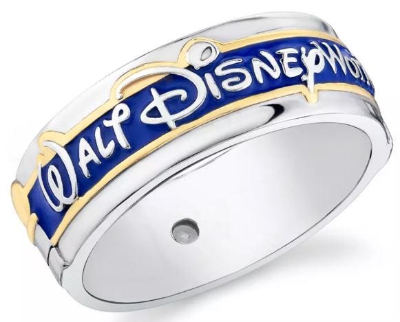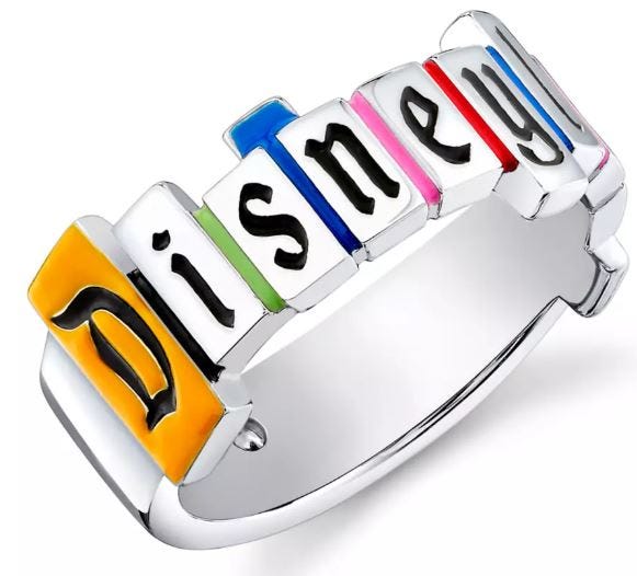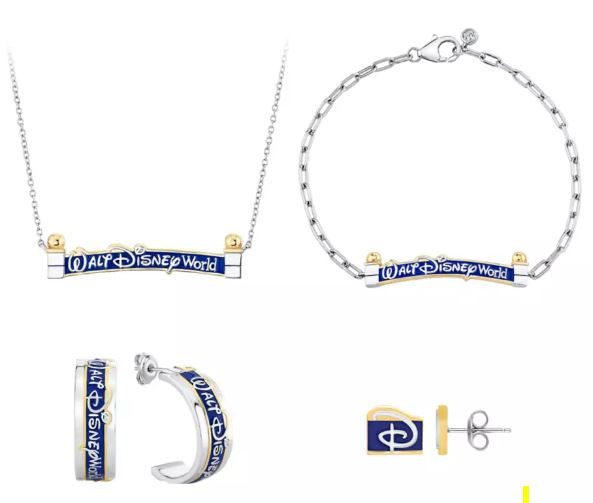 This set is done in .925 sterling silver and finished in pure platinum and 18k yellow gold. Inspired by the legendary Walt Disney World Resort sign, the set includes a necklace, bracelet, hoop earrings, and stud earrings.
