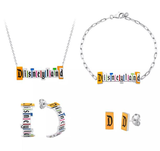 It features the “legendary Disneyland Resort sign”, the set includes a necklace, bracelet, hoop earrings, and stud earrings.