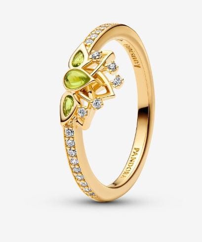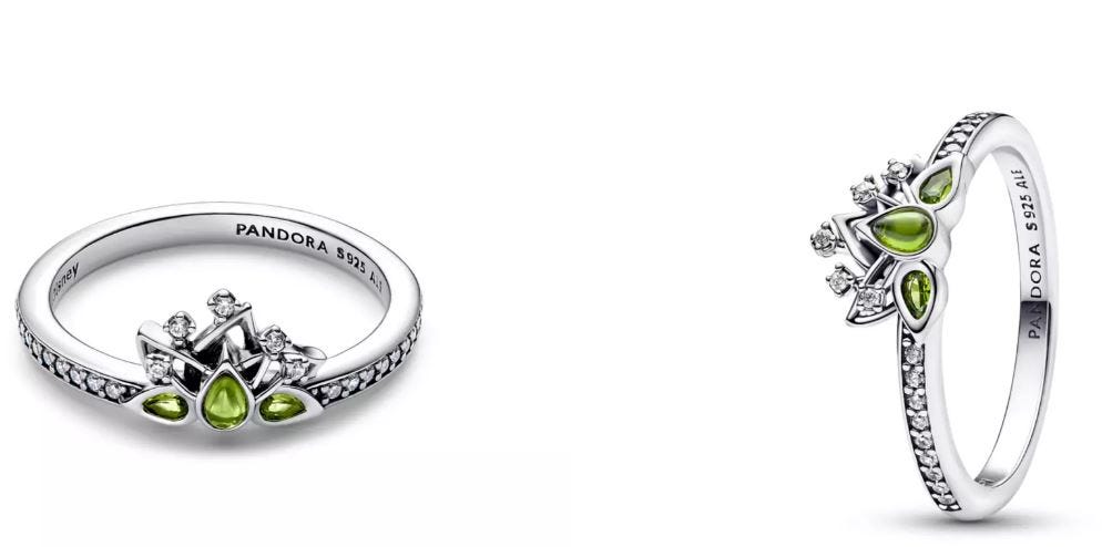 “Crafted from sterling silver, the enchanting design features three pear-shaped, light green crystals, all complemented by 18 bead-set and five prong-set round brilliant-cut cubic zirconia. Together, the stones create a lily pad shape with openwork leaves, adorned with smaller stones inspired by the tiara worn by Tiana in Disney's The Princess and the Frog.”