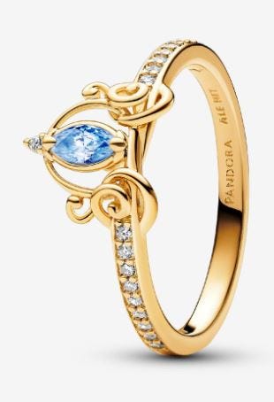 “Get ready to have a ball with the Disney Cinderella's Carriage Ring, showcasing a blue marquise-shaped stone at the centre. Swirling openwork shapes in 14k gold plating form the enchanted carriage motif and connect to the ring band, which is set with sparkling clear cubic zirconia pavé on half of the band.”