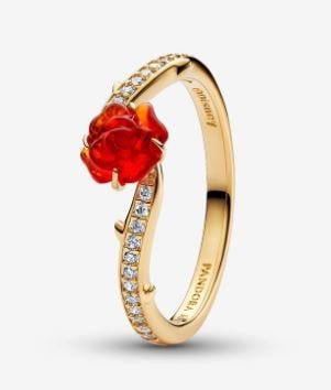 “Add an enchanting touch to your look with our Disney's Beauty and the Beast ring. Crafted in 14k gold plating, it features a Murano glass rose with sparkling stones and thorn details along the band.”