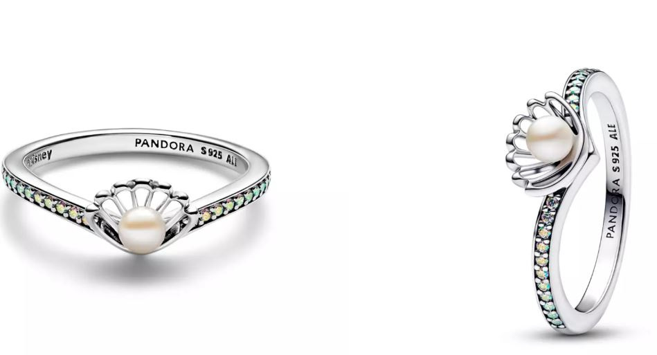 “Inspired by Ariel, the unique openwork seashell design showcases a white treated freshwater cultured pearl at its center. A channel of stones along the wishbone-shaped band shimmer with light, recalling sunshine on ocean waves. Wear it as a symbol of Ariel's journey and the transformative power of being true to yourself.”