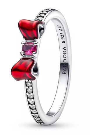 “Crafted from sterling silver, the red enameled bow centerpiece is accented with a fuchsia rose man-made crystal. The ring band is channel-set with sparkling clear cubic zirconia stones and showcases an engraved Disney logo on the inner band.”