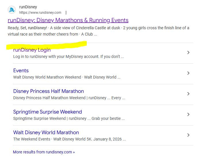 First, if you search “runDisney” on Google, the login link will appear at the top of your screen.